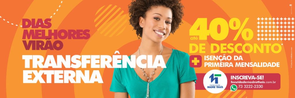 A Faculdade Madre Thaís (FMT-Ilhéus) oferece até 40% de desconto nas mensalidades para alunos vindos de outras instituições e que queiram ingressar em seus cursos de graduação em Bacharelado e graduação Tecnológica. Os interessados podem fazer a inscrição ou obter maiores informações pelo WhatsApp (73) 3222-2330.