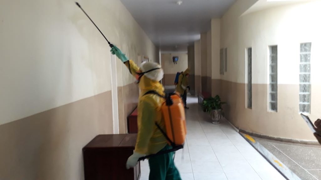 Na sexta-feira foi a vez da higienização do prédio da secretaria de Saúde, onde foi testado positivo um funcionário. Segundo a secretária Jamylly os três funcionários estão em quarentena e sendo monitorados.
