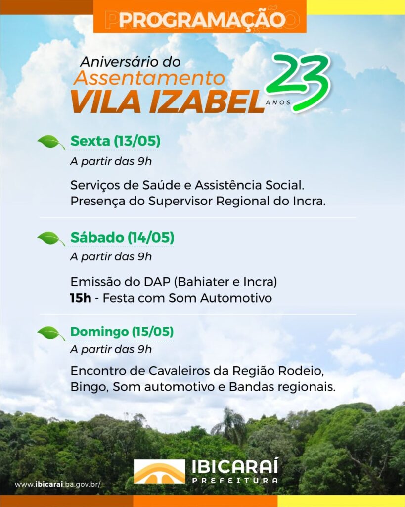 Essa semana quem será contemplado com os serviços da Prefeitura de Ibicaraí será o Assentamento Vila Izabel, que fica localizado na parte leste da cidade, próximo do distrito do Cajueiro Velho. O Assentamento está fazendo há 23 anos e terá três dias de comemorações, com festa e serviços ofertados pelas secretarias de Saúde e Assistência Social.