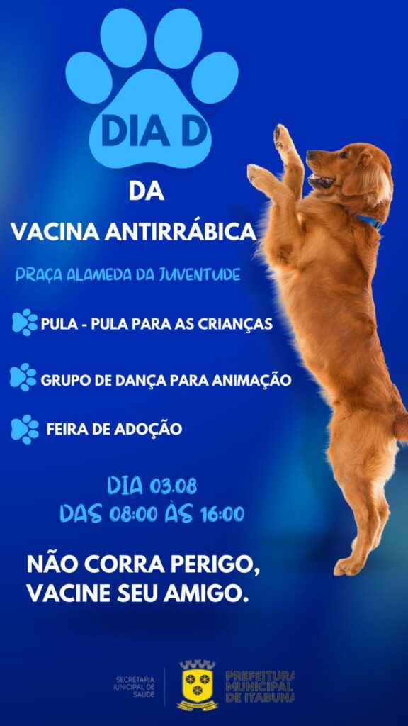 Sábado, dia 3, será o Dia D da Campanha Nacional de Vacinação Contra a Raiva em Itabuna com diversas atividades na Alameda da Juventude entre as 8h30min e 16 horas. Além de imunizar cães e gatos, haverá doação de animais pelo Centro de Controle de Zoonoses (CCZ) da Secretaria Municipal de Saúde e recreação para as crianças com pula-pula e apresentação de grupos de dança.