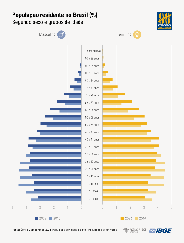 “Ao longo do tempo a base da pirâmide etária foi se estreitando devido à redução da fecundidade e dos nascimentos que ocorrem no Brasil. Essa mudança no formato da pirâmide etária passa a ser visível a partir dos anos 1990 e a pirâmide etária do Brasil perde, claramente, seu formato piramidal a partir de 2000. O que se observa ao longo dos anos, é redução da população jovem, com aumento da população em idade adulta e também do topo da pirâmide até 2022”, analisa a gerente.