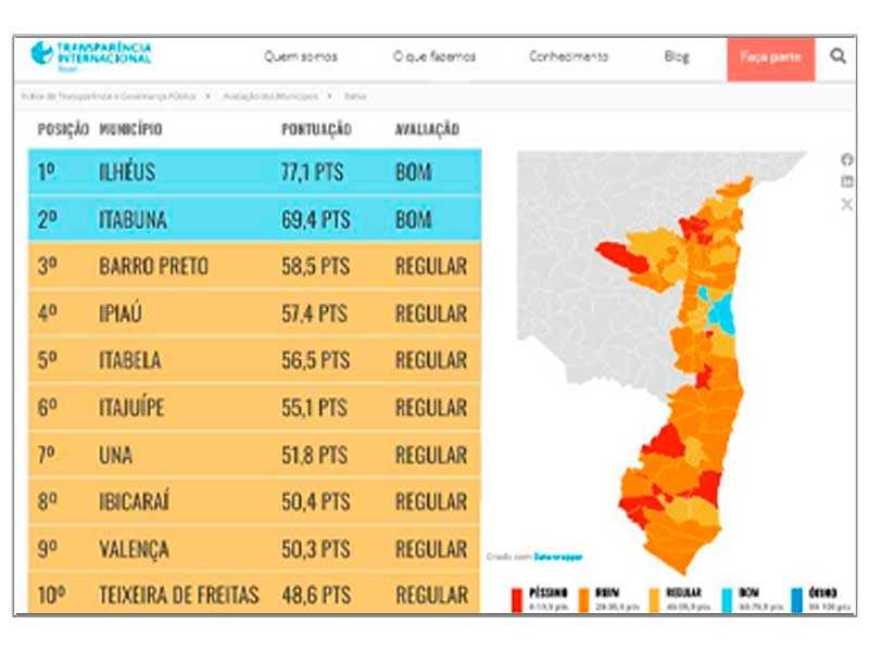 A Prefeitura de Ilhéus comemora mais um feito importante no cenário estadual. O município conquistou o primeiro lugar no ranking de transparência e governança pública da Transparência Internacional – Brasil, que avaliou 78 municípios baianos. O levantamento foi conduzido pelo Instituto Nossa Ilhéus, utilizando metodologia reconhecida internacionalmente pela Transparência Internacional. Ilhéus alcançou 77,1 pontos, destacando-se entre as prefeituras de cinco Territórios de Identidade na Bahia: Litoral Sul, Baixo Sul, Extremo Sul, Costa do Descobrimento e Médio Rio de Contas.