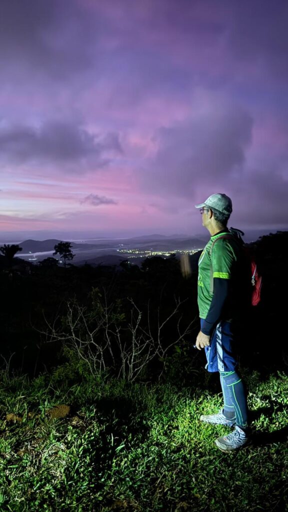 Nos reunimos no Calçadão Dagmar Pinto às 2 horas e partimos animados rumo à montanha mágica. Foram quase três horas caminhando, até a noite se despedir, abrindo espaço para o dia e o seu astro rei (sol). Passamos pela Tupã no “breu da noite” e chegamos na fazenda de Abel ainda no escuro. O dia começou a “chegar” quando passamos pela fazenda de Ana Gama e os primeiros aventureiros conseguiram “pegar” imagens do nascer do sol no topo da montanha, na fazenda de Rui.
