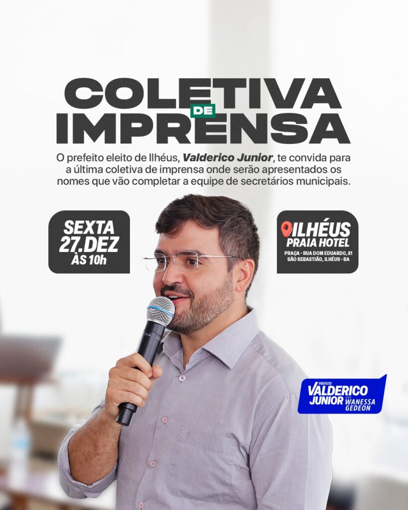 O prefeito eleito de Ilhéus, Valderico Junior, te convida para a última coletiva de imprensa deste ano, na qual serão apresentados os nomes que irão completar a equipe de secretários municipais para a gestão 2025-2028. A coletiva será realizada na sexta-feira, 27 de dezembro, às 10h, no Ilhéus Praia Hotel, localizado na Praça Dom Eduardo, 81, Centro, Ilhéus-BA.
