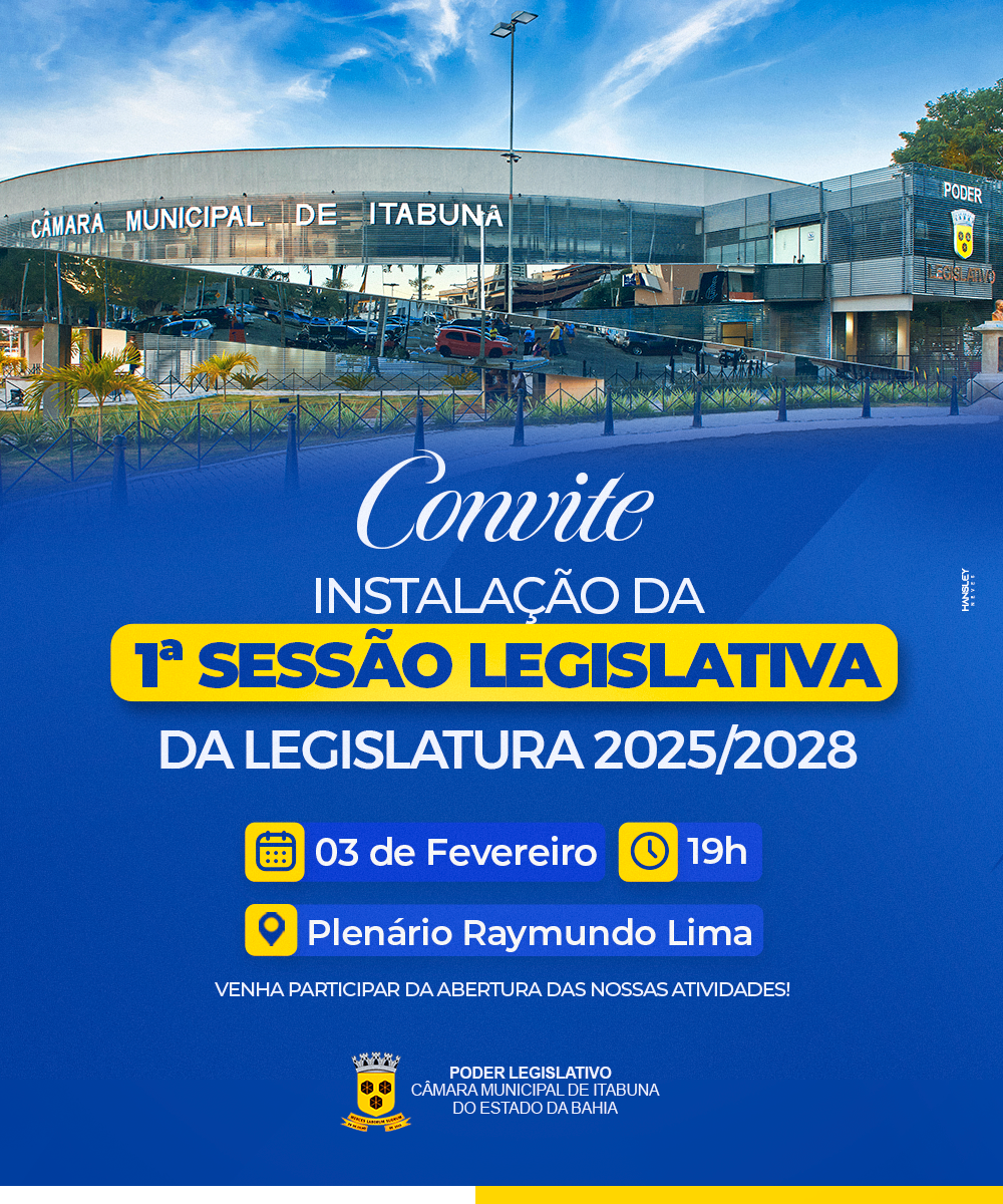 A Câmara de Vereadores, em nome do seu presidente, vereador Manoel Porfírio (PT), convida a população itabunense para a sessão que dará início ao 1º Período Ordinário de Sessões Plenárias e reuniões das Comissões Técnicas Parlamentares.
