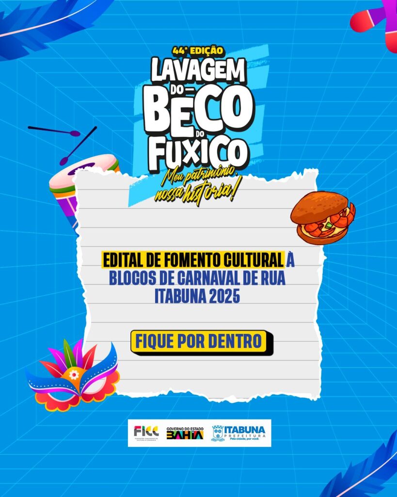 A Prefeitura de Itabuna, por meio da Fundação Itabunense de Cultura e Cidadania (FICC), divulgou hoje, dia 3, o Edital de Fomento Cultural destinado à seleção de blocos carnavalescos para a programação oficial da 44ª Lavagem do Beco do Fuxico. O chamamento público tem como objetivo fortalecer a cultura popular e incentivar a tradição do carnaval de rua no município.