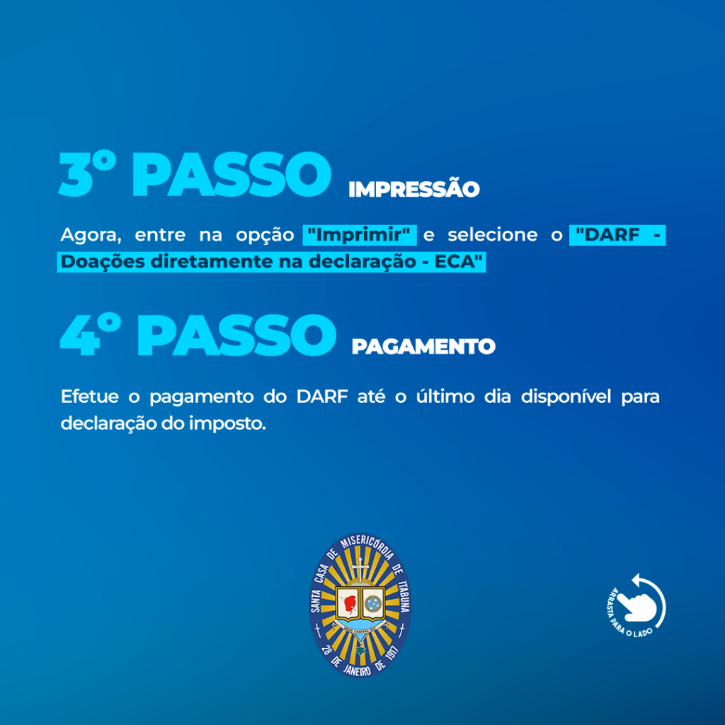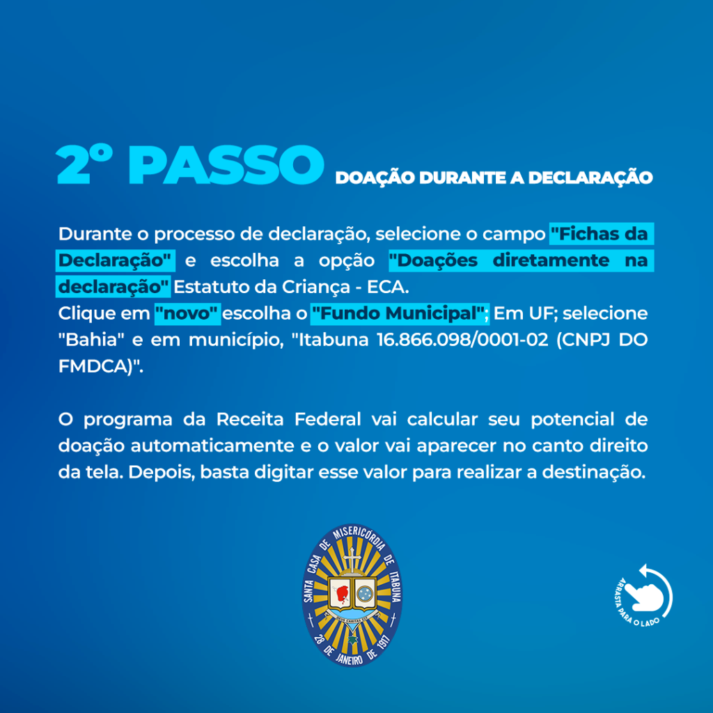 O Diretor Financeiro da Santa Casa de Misericórdia de Itabuna, Amilton Fiaes, explica que a destinação do imposto é um processo seguro e regulamentado. “Pessoas físicas que fazem a declaração no modelo completo podem destinar até 6% do Imposto de Renda devido, enquanto empresas tributadas pelo lucro real podem contribuir com até 1%. O valor vai diretamente para o Fundo Municipal dos Direitos da Criança e do Adolescente (FMDCA), que repassa os recursos para a Santa Casa”, explica.