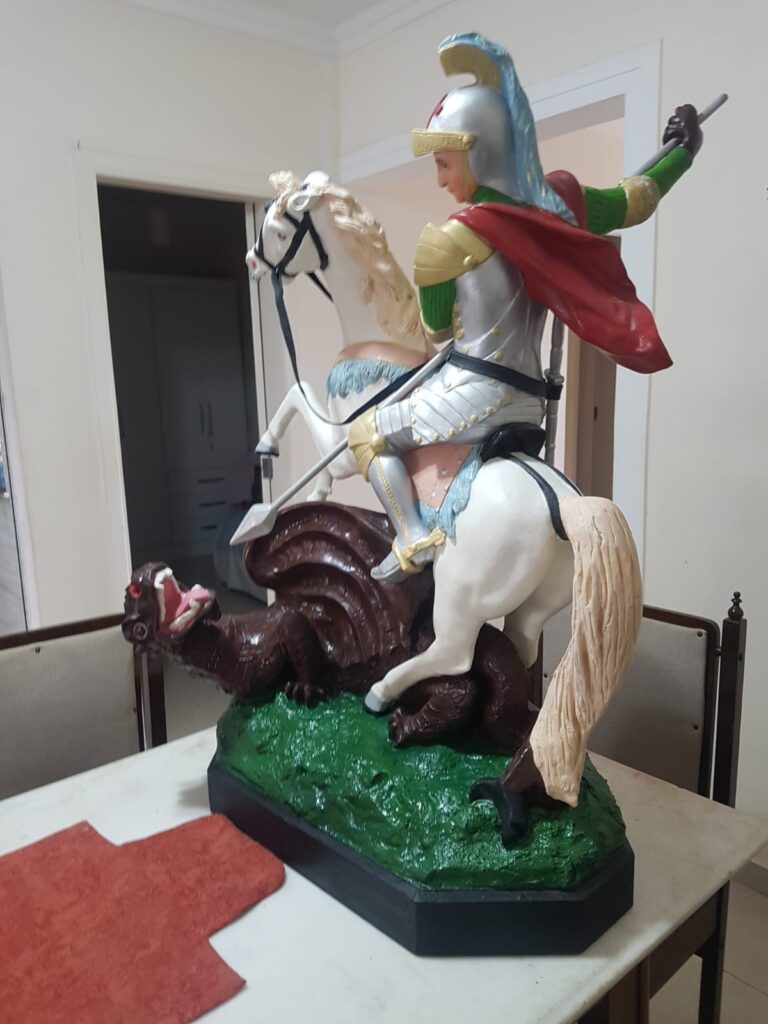 Imagem de São Jorge, padroeiro do distrito do Cajueiro em Ibicaraí, é restaurada pela artista plástica Anne Oliveira