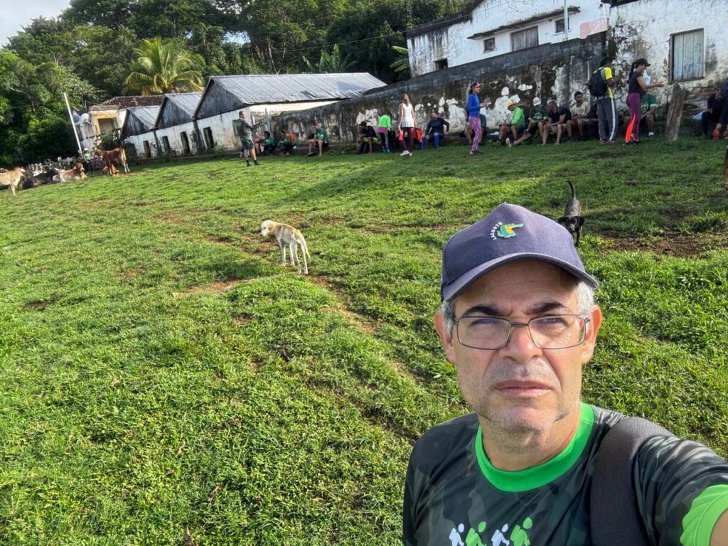 Nos encontramos na rodoviária e, antes das 6h, partimos rumo à Vila Emílio Izabel. No distrito, seguimos pela direção norte, sentido estrada da Jussara, entrando no ramal da fazenda de Luciano. Foi aí que começamos a subida pela Ladeira do Padre até os Goveias, onde atravessamos um trecho de cacau e fizemos a primeira parada na segunda sede, para hidratar, comer e contemplar a paisagem. Do local, é possível avistar as cidades de Barro Preto e Itabuna.