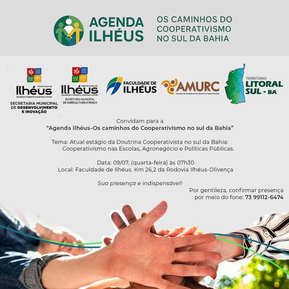 A Prefeitura de Ilhéus, por meio da Secretaria Municipal de Desenvolvimento Econômico e Inovação, promoverá, na próxima quarta-feira (09), às 07h30, o encontro técnico “Agenda Ilhéus – Os caminhos do Cooperativismo no sul da Bahia”. O evento acontecerá na Faculdade de Ilhéus e contará com a participação de especialistas, representantes de cooperativas e lideranças regionais.