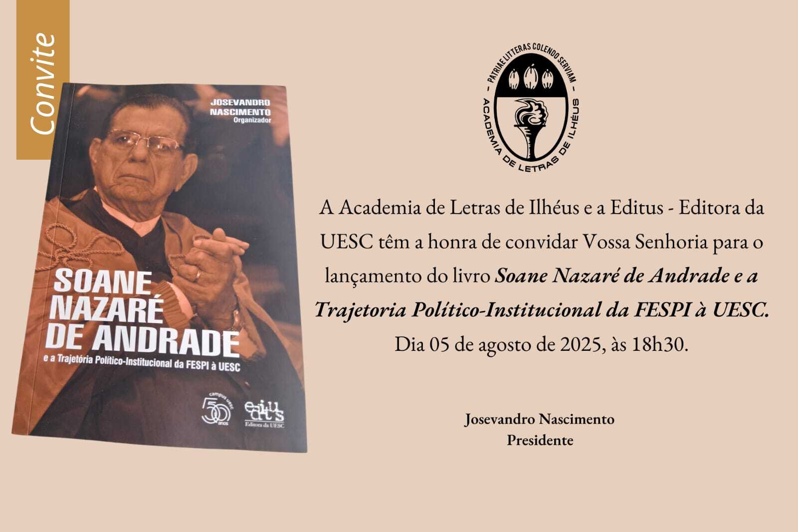 Sob a organização do professor Josevandro Nascimento, presidente da Academia de Letras de Ilhéus, na terça-feira, 5/8, às 18h30, na sede da ALI, será lançado o livro Soane Nazaré de Andrade e a trajetória político-institucional da FESPI à UESC (Editus editora).