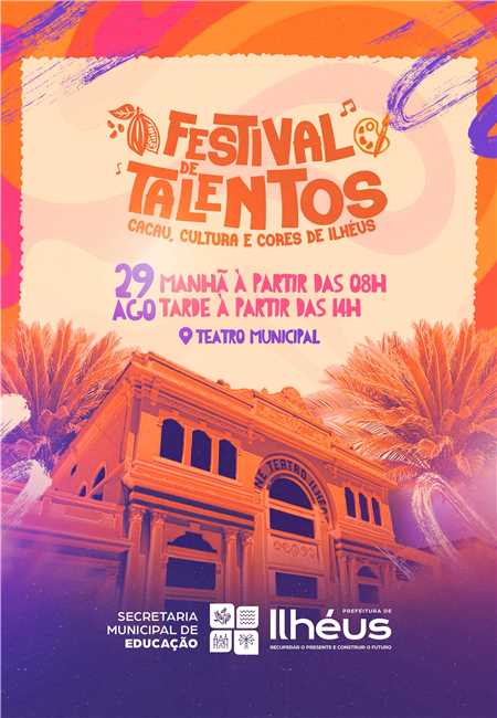 A Prefeitura de Ilhéus, por meio da Secretaria Municipal de Educação, realiza na próxima sexta-feira (29), o Festival de Talentos 2025, no Teatro Municipal, das 8h às 17h. Com o tema “Cacau, Cultura e Cores de Ilhéus”, o evento propõe uma celebração da riqueza natural, cultural e da diversidade que marcam a identidade do município.