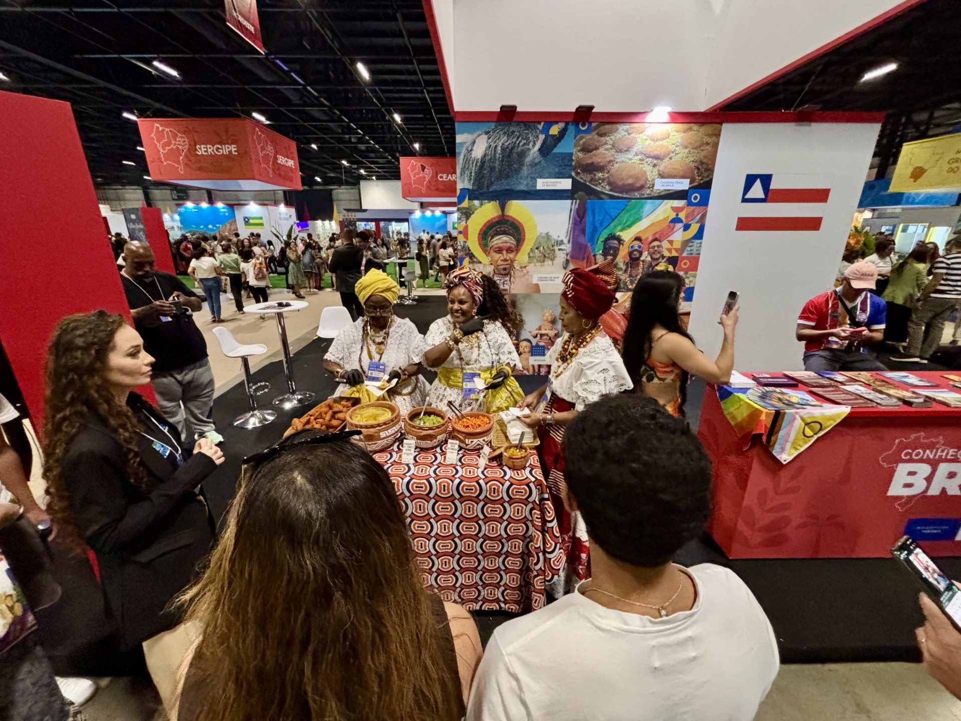 “O estande da Bahia foi destaque no Salão, com a participação de municípios parceiros e ativações que animaram os visitantes, com elementos da nossa cultura. Distribuímos acarajé, fizemos turbantes afro e eles levaram também de lembrança uma foto feita com a baiana típica, no espaço instagramável”, relatou a gerente de Mercado Nacional da Setur-BA, Tatiana Harfush.