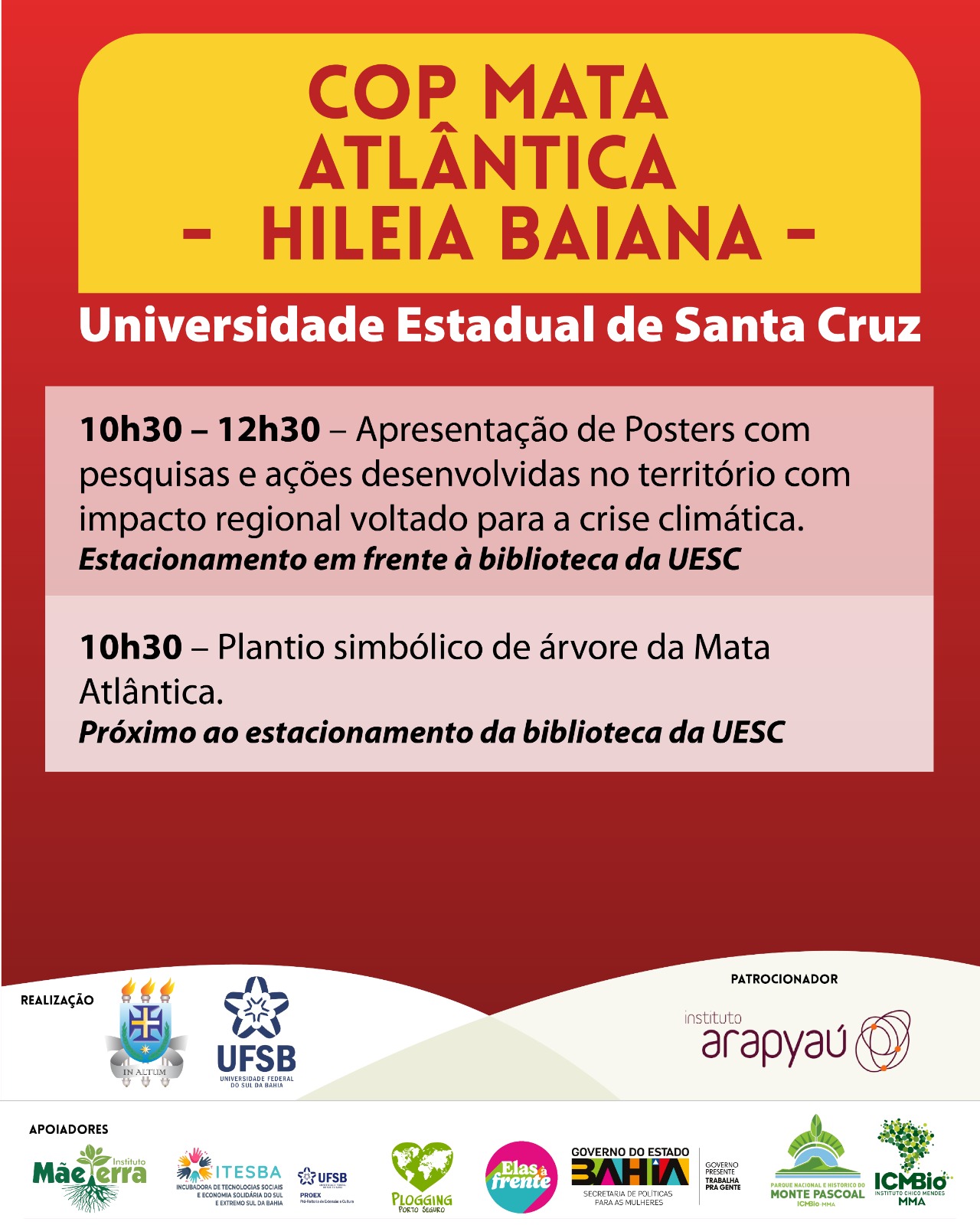 O Campus Professor Soane Nazaré de Andrade, da Universidade Estadual de Santa Cruz (Uesc), sediará, no dia 14 de outubro de 2025, a etapa final da COP Mata Atlântica – Hileia Baiana. O evento é promovido em parceria com a Universidade Federal do Sul da Bahia (UFSB) e reunirá cientistas, povos tradicionais, movimentos sociais e gestores públicos para debater o papel estratégico da Mata Atlântica no enfrentamento da crise climática.
