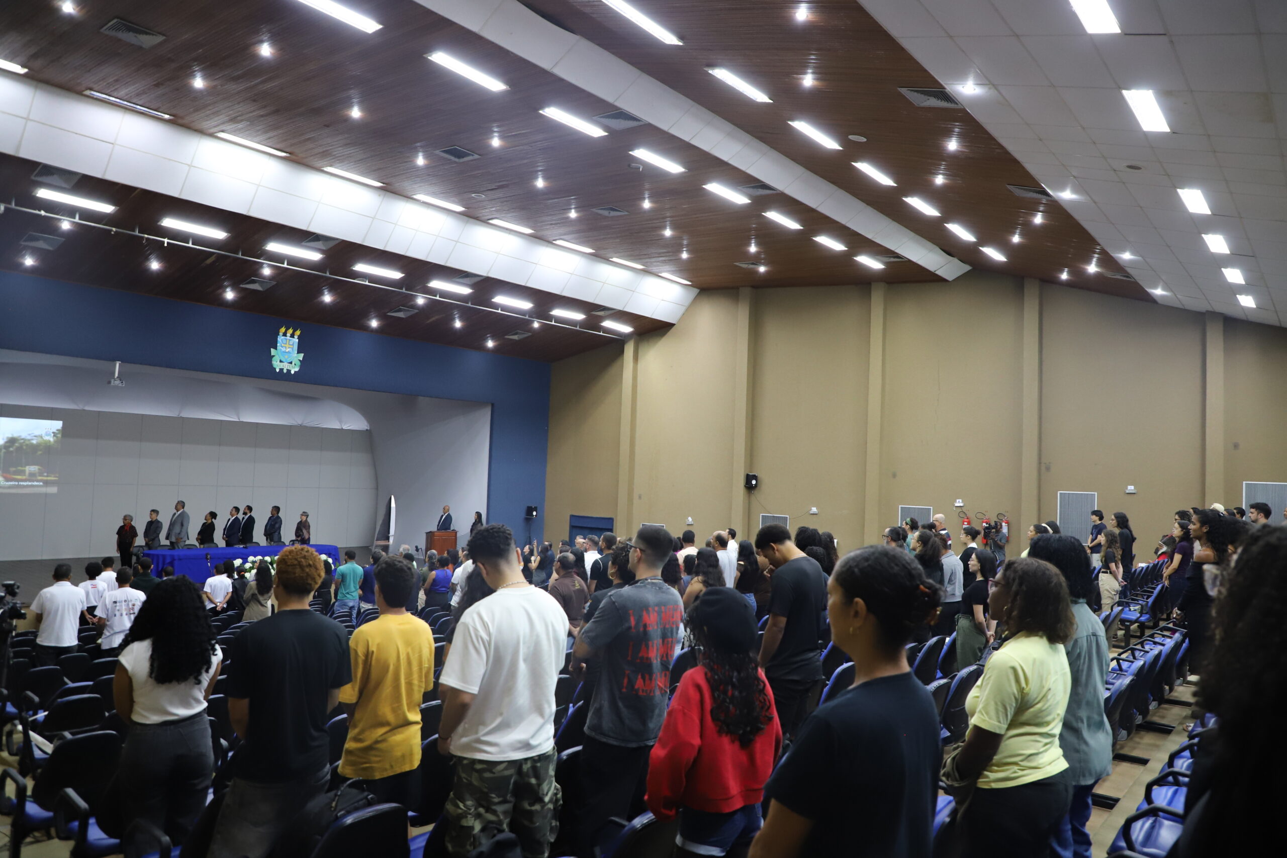 Cultura – A plenária institucional Uesc-UFSB contou com a apresentação do Coral do Colégio Estadual de Salobrinho, sob a regência do maestro Daniel Ferreira Cruz, que emocionou o público ao executar as músicas autorais “Todo mundo tem seu lugar (PCD)” e “Rio Cachoeira”, e “Olhos Coloridos”, de Sandra de Sá.