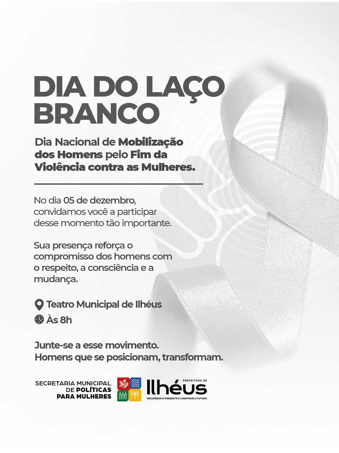 A Prefeitura de Ilhéus, por meio da Secretaria Municipal de Políticas para Mulheres, realiza, nesta sexta-feira (05), uma ação referente ao Dia do Laço Branco — Dia Nacional de Mobilização dos Homens pelo Fim da Violência contra as Mulheres. A data busca chamar a atenção para a responsabilidade masculina na construção de relações mais justas e seguras, incentivando atitudes que promovam respeito e prevenção.
