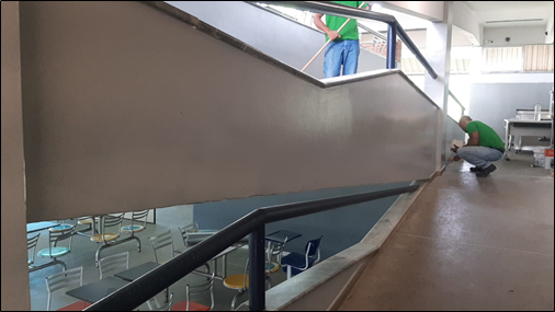 Os serviços de pintura incluíram raspagem, correção de avarias, aplicação de massa acrílica, lixamento e pintura das áreas de preparo, depósitos e circulação interna, bem como das áreas de acesso dos estudantes e do espaço destinado à formação de filas até o setor de self-service, reforçando as condições de higiene e segurança.
